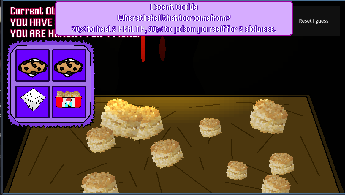Survive 4 rounds of a biscuit-roulette, where each mistake will cause you to start over, because not a lot of people can recover well after eating something rotten...