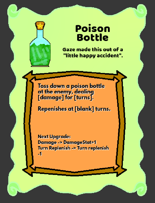 So, the way I've thought about implementing this is that every skill is going to have their own special screen, which is also animated. This stands as a placeholder for the poison bottle, but otherwise, this is going to be the normal-looking portion of the skills and stats.